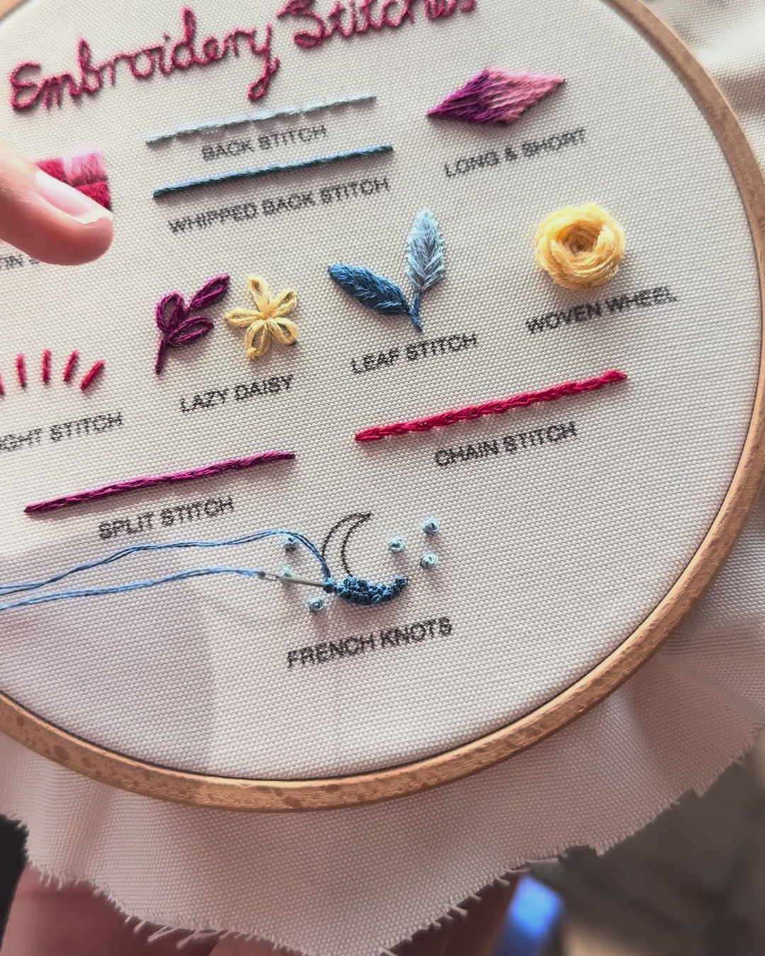 Our Beginner Stitch Sampler Kit teaches 11 essential stitches: back stitch, running back stitch, long and short, straight stitch, lazy daisy, leaf stitch, satin stitch, woven wheel, split stitch, chain stitch, and French knots. Each one is colour-coded and clearly labelled on the practice fabric, so you can follow along step by step.